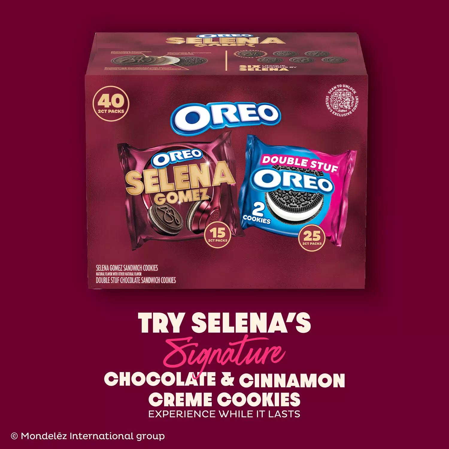 Try Selena’s Signature OREO Cookies in the Selena Gomez & OREO Double Stuf Sandwich Cookies Variety Pack. which combines two delicious kinds of OREO Cookies for a magnificent cookie mashup! Selena Gomez OREO Cookies are flavorful. horchata-inspired sweet snacks featuring a layer of Chocolate and Cinnamon Flavor Creme atop another layer of Sweetened Condensed Milk Flavor Creme with Cinnamon Sugar Inclusions. sandwiched between two OREO Chocolate Cinnamon Flavored wafer cookies embossed with one of six unique designs inspired by the superstar. This cookie variety pack also contains 25 snack packs of OREO Double Stuf Chocolate Sandwich Cookies. stuffed with delicious OREO creme filling!