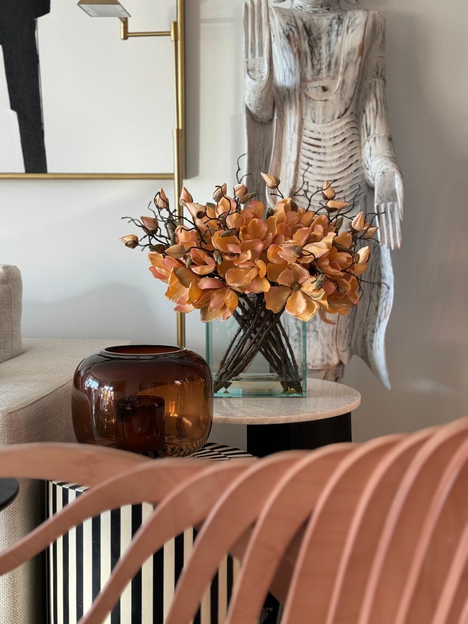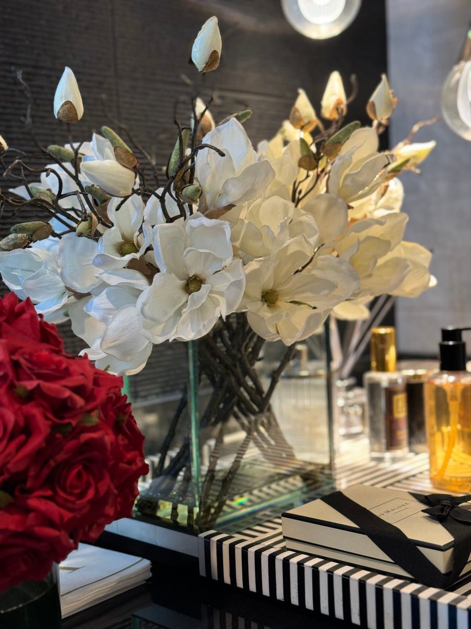 Square Casa Moderna glass planter with multiple stems of peach OR white magnolia blossoms. foliage and sand blasted grape wood anchored in our illusion water. Enjoy beautiful. lifelike magnolia tree branches that won’t fade after spring awakens. Displayed here in a stylish clear glass planter. magnolia flowers are cheerful and elegant in any season. Each hand-placed blossom and leaf is crafted with vivid color and exceptional detail. a tribute to Mother Nature’s artistry. Showcase this lovely faux tree on your dining table or living room tabletop.